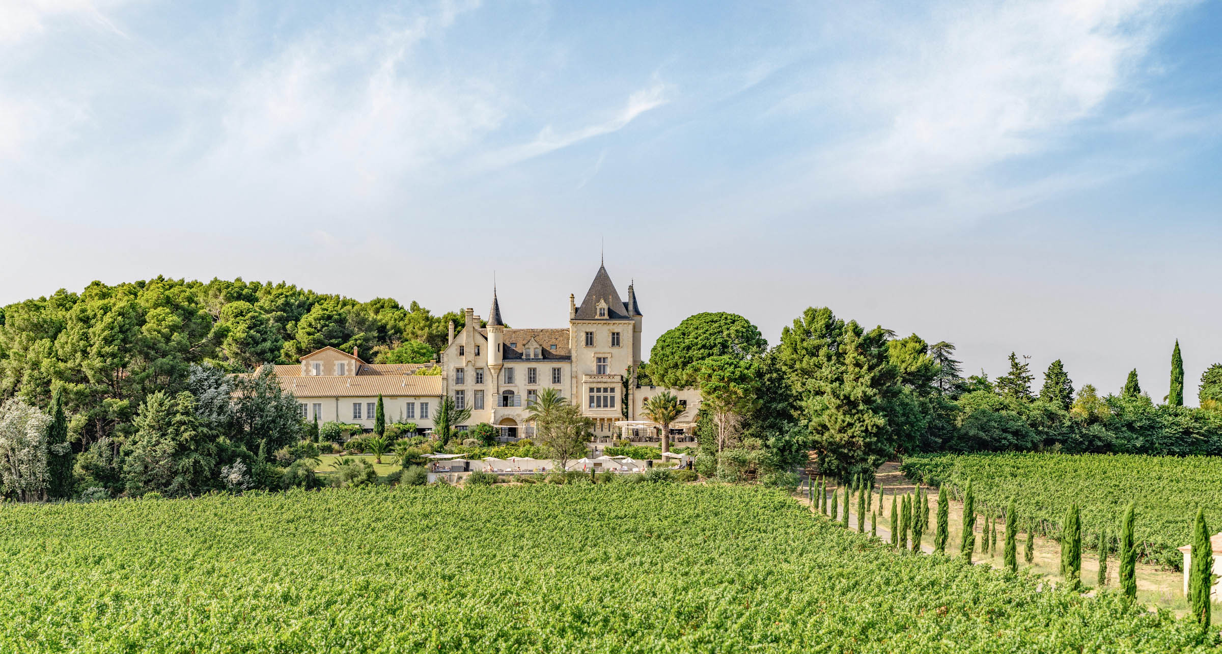 Le Château Les Carrasses est un domaine viticole du Languedoc du 19ème siècle, restauré et converti en résidence de villégiature luxueuse, avec des résidences indépendantes, un restaurant à la cuisine méditerranéenne, une cave et des prestations d’hôtel première classe.